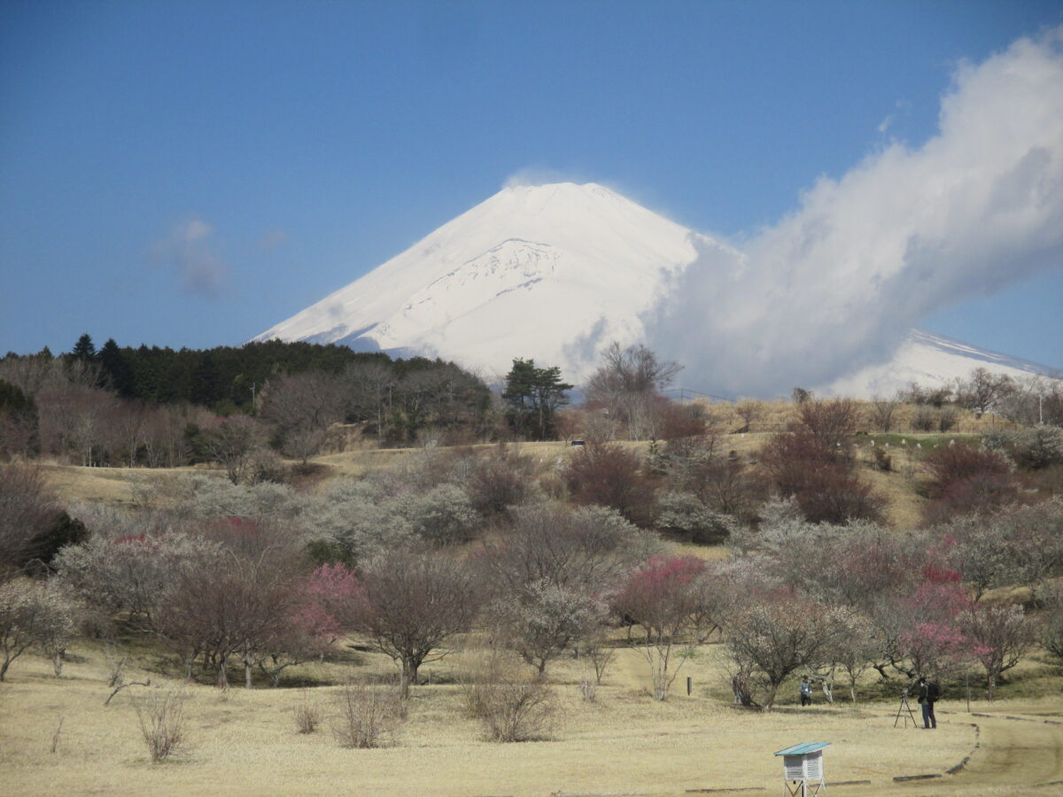 約50,000平方メートルの園内に大小あわせて700本の紅白の梅と200本の桜あり、富士山を背景に梅や桜に囲まれながらウォーキングやランニングを楽しめます。