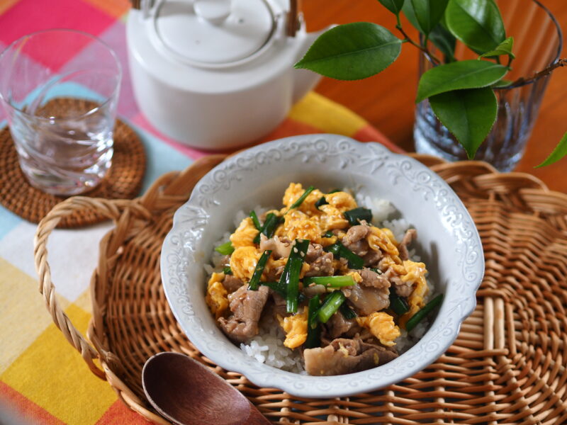 疲労回復にオススメ! 栄養たっぷりの豚⾁・にら・卵でスタミナたっぷりの丼にしました。
