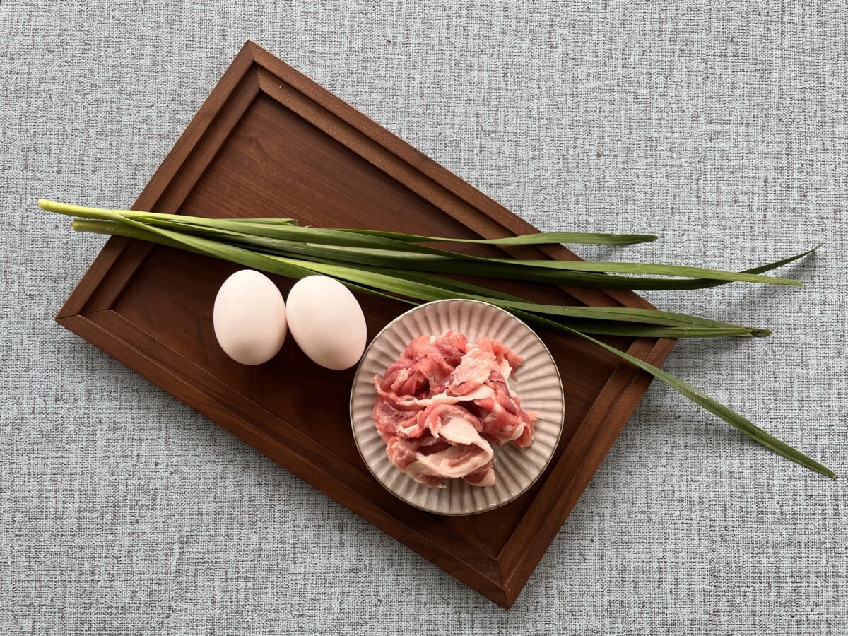 ・豚⾁とにらをそれぞれ4〜5cm幅に切る。