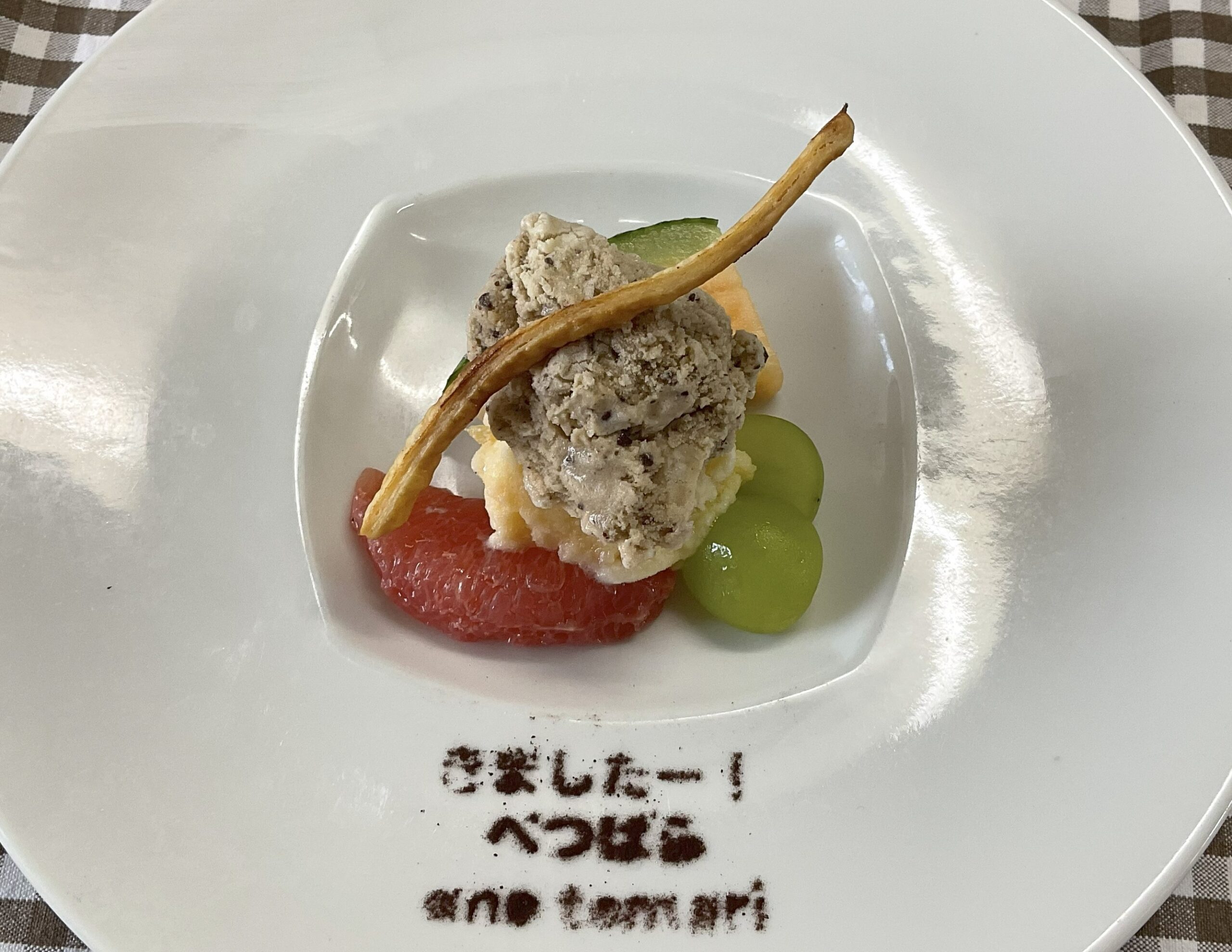 エビとホタテのハンバーグ / フルーツと自家製アイスの盛り合わせ