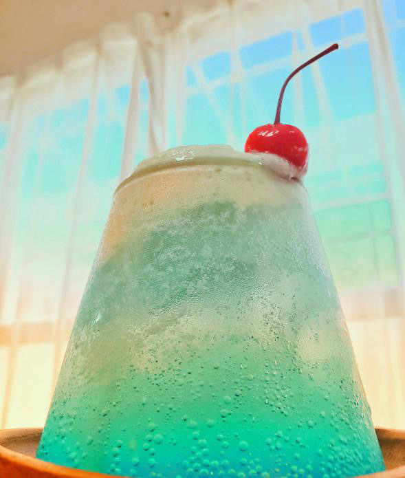 富士山型のグラスで飲む青いクリームソーダは雪景色の富士山をイメージしており、子どもからお年寄りまで大変人気があります。チーズをふんだんに使用したバスクチーズケーキと一緒にどうぞ。季節に合ったデザートやメニューをご用意しておりますので、時季によっていろいろお楽しみいただけます。