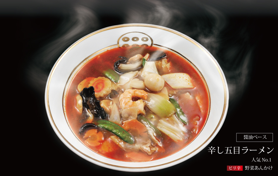 「辛し五目ラーメン」は具だくさんのあんかけ甘辛ラーメンで、辛い中にも深い味わいのある人気NO.1メニューです。