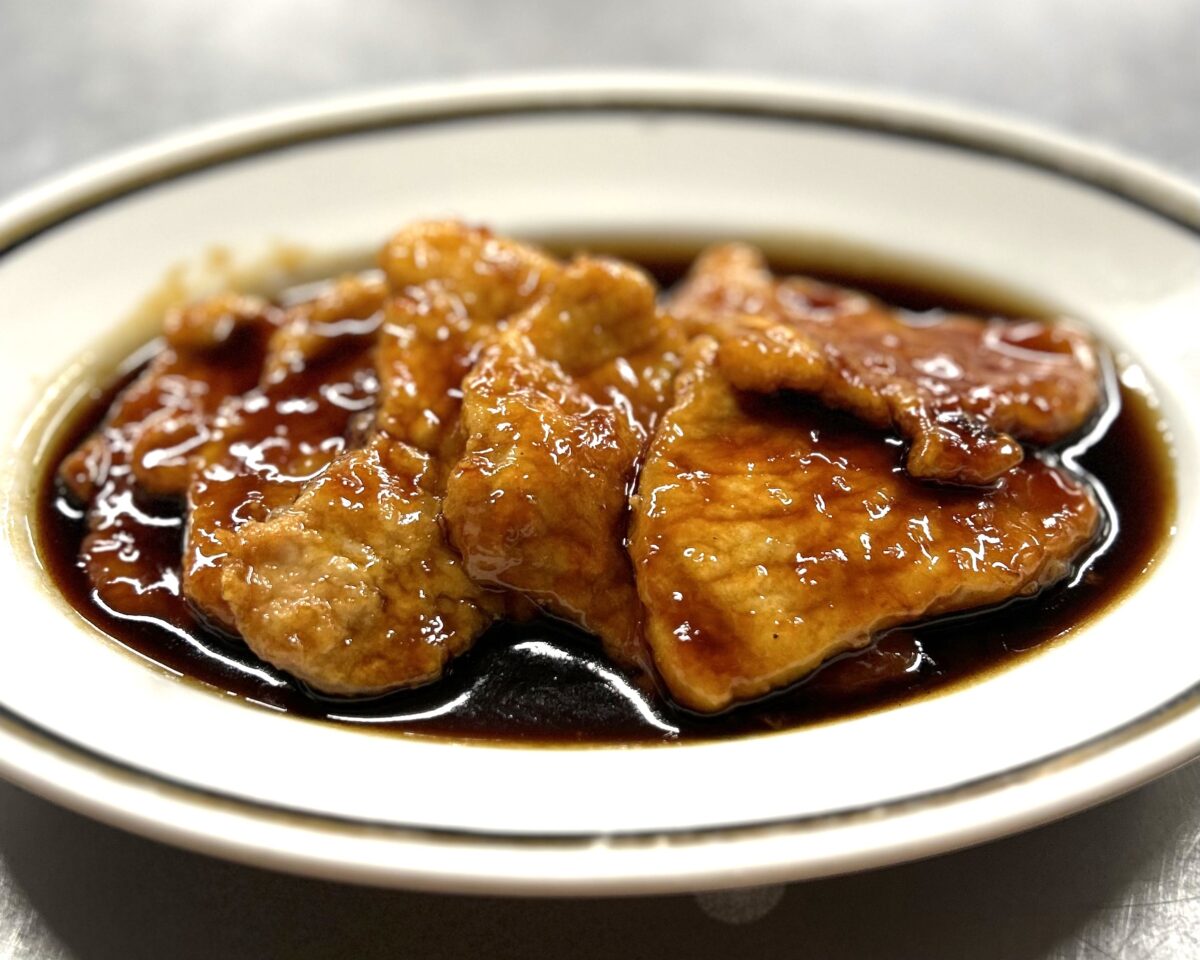 当店人気メニューの黒酢のすぶたは、香ばしい熟成黒酢の香りと優しい甘みが特徴。ランチタイムは定食セットも提供しています。